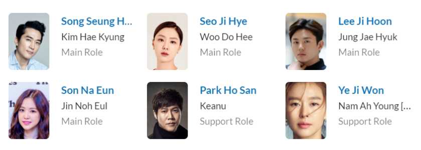 نقش های اصلی Song Seung Heon در نقش Kim Hae Kyung بازیگر سریال های : Seo Ji Hye در نقش Woo Do Hee بازیگر سریال های : Lee Ji Hoon در نقش Jung Jae Hyuk بازیگر سریال های : Son Na Eun در نقش Jin No Eul سایر بازیگران Lee Hyun Jin در نقش Kang Gun Woo Kim Seo Kyung در نقش Lee Byung Jin Jun Kook Hyang در نقش Lee Moon Jung Ye Ji Won در نقش Nam Ah Young Go Kyu Pil در نقش Park Jin Kyu Ahn Tae Hwan در نقش Kim Jung Hwan Oh Hye Won در نقش Im So Ra Jung Eun Pyo در نقش Woo In Ho Yoon Bok In در نقش Jun Sung Ja Park Ho San در نقش Keanu Kim Jung Hyun در نقش Young Dong Jung Sang Hoon در نقش ER doctor Kim Hyun Sook در نقش Keun Hee Lee Shi Unلیست بازیگران