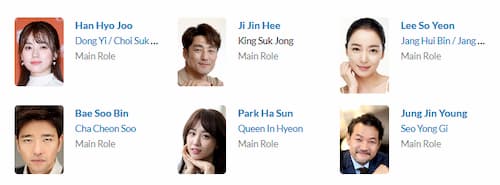 گویندگان: زهره شکوفنده (دونگ یی)، منوچهر والی زاده (امپراتور سوکجونگ)، مینو غزنوی (بانو جانگ اوکی جونگ)، افسانه آریابقا از قسمت ۱ تا ۹ (ملکه اینهیون)، فرانک رفیعی طاری از قسمت ۱۰ تا آخر (ملکه اینهیون)، سمیه رهنمون (گئوم)، شراره حضرتی (ملکه دواگر، مادر شاه سوکجونگ)، نصرااله مدقالچی (پدر دونگ یی)، تورج نصر (او تائه پونگ (برادر اوتائه سوک)، حسین سرآبادانی (برادر دونگ یی)، کامبیز شکوفنده (چان سو)، کریم بیانی (جانگ هی جائه)، حسین عرفانی (فرمانده سئو)، سحر صحامیان (جونگ یم)، مینا نخعی (اونگ یم)، بتسابه کاظمی (آیجونگ) و…