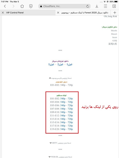 3- در همان برنامه aloha تب جدید باز کرده و وارد سایت پروموویز شده و سریال مدنظر خود را سرچ کنید و روی یکی از لینک های دانلود بزنید: