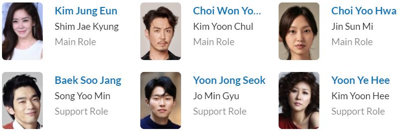نقش های اصلی Kim Jung-Eun در نقش Sim Jae-Kyeong Choi Won-Young در نقش Kim Yoon-Cheol بازیگر سریال های : The Gentlemen of Wolgyesu Tailor Shop Choi Yu-Hwa در نقش Jin Sun-Mi سایر بازیگران Shim Hye-Jin در نقش Ha Eun-Hye Lee Joon-Hyuk در نقش Seo Ji-Tae Jung Soo-Young در نقش Kim Hee-Jung Ahn Nae-Sang در نقش No Chang-Beom Yoon Ye-Hee در نقش Kim Yoon-Hee Yun Jong-Seok در نقش Jo Min-Kyu Kim Ja-Young در نقش Jung-Soon Baek Soo-Jang در نقش Song Yoo-Minلیست بازیگران