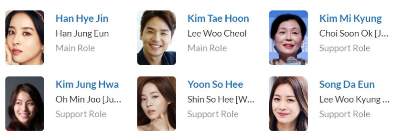 نقش های اصلی Han Hye Jin در نقش Han Jung Eun بازیگر سریال های : Kim Mi Kyung در نقش Choi Soon Ok سایر بازیگران Kim Tae Hoon در نقش Lee Woo Chul Yoon So Hee در نقش Shin So Hee Kim Jung Hwa در نقش Oh Min Joo Song Da Eun در نقش Lee Woo Kyung Jung Seo Yunلیست بازیگران