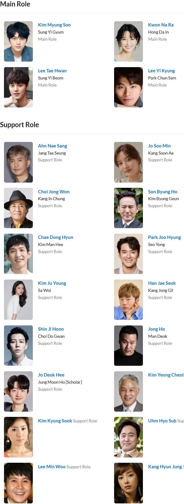 نقش های اصلی Kim Myung-Soo در نقش Sung Yi-Gyeom بازیگر سریال های : Kwon Na-Ra در نقش Hong Da-In بازیگر سریال های : Lee Yi-Kyung در نقش Park Chun-Sam بازیگر سریال های : Lee Tae-Hwan در نقش Sung Yi-Beom بازیگر سریال های : نقش های مکمل Jo Soo-Min در نقش Kang Soon-Ae Ahn Nae-Sang در نقش Jang Tae-Seung Choi Jong-Won در نقش Kang In-Chung Son Byung-Ho در نقش Kim Byeong-Geun Chae Dong-Hyun در نقش Kim Man-Hee Park Joo-Hyung در نقش Seo Yong Shin Ji-Hoon در نقش Choi Do-Gwan Han Jae-Suk در نقش Kang Jong-Gil Kim Ju-Young در نقش Sa-Wolلیست بازیگران
