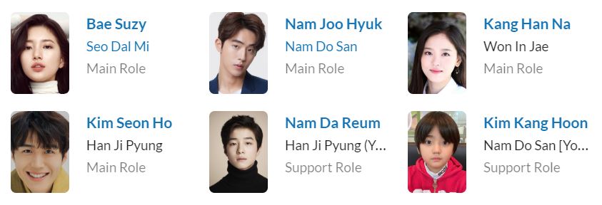 نقش های اصلی Nam Joo Hyuk در نقش Nam Do San بازیگر سریال های : Bae Suzy در نقش Seo Dal Mi -بازیگر سریال های: Kim Sun Ho در نقش Han Ji Pyung -بازیگر سریال های: Kang Han Na در نقش Won In Jae -بازیگر سریال های: سایر بازیگران Nam Da Reum در نقش Han Ji Pyung Kim Kang Hoon در نقش Nam Do San Yoo Su Bin Seo Yi Sookلیست بازیگران