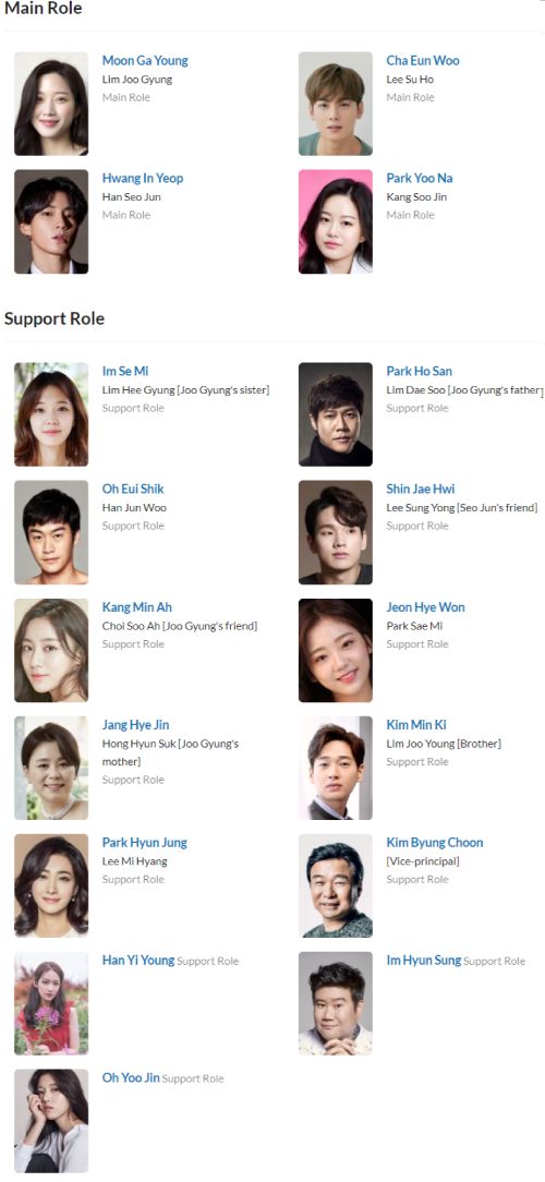 Moon Ka-Young در نقش Im Joo-Kyeong بازیگر سریال های : Cha Eun-Woo در نقش Lee Soo-Ho بازیگر سریال های : Rookie Historian Goo Hae Ryung Hwang In-Yeop در نقش Han Seo-Joon Park Ho-San در نقش Joo-Kyeong’s father Im Se Mi در نقش Lim Hee Gyung Park Ho San در نقش Lim Dae Soo Oh Eui Shik در نقش Han Jun Woo Shin Jae Hwi در نقش Lee Sung Yong Kang Min Ah در نقش Choi Soo Ah Jeon Hye Won در نقش Park Sae Mi Jang Hye Jin در نقش Hong Hyun Suk Kim Min Ki در نقش Lim Joo Young Park Hyun Jung در نقش Lee Mi Hyang Kim Byung Choon Han Yi Young Im Hyun Sung Oh Yoo Jin Supلیست بازیگراننقش های اصلی