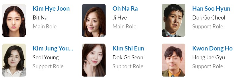 نقش های اصلی Kim Hye-Jun در نقش Bit-Na Oh Na-Ra در نقش Ji-Hye بازیگر سریال های : سایر بازیگران Han Soo-Hyun در نقش Doggo Cheol Kim Jung-Young در نقش Seol-Young Choi Kyu-Jin در نقش Yoo Hae-Joon Kim Si-Eun در نقش Doggo Sun Kwon Dong-Ho در نقش Hong Jae-Kyuلیست بازیگران